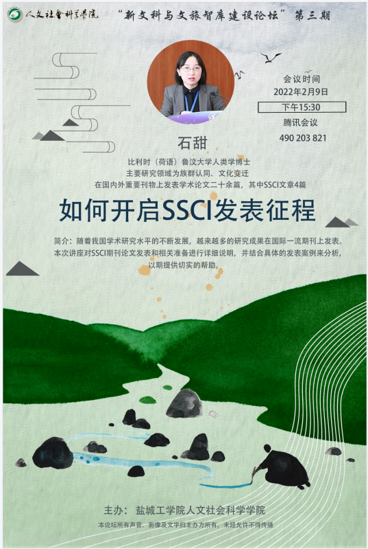 主讲人石甜系比利时(荷语)鲁汶大学人类学博士,主要研究领域为族群认同、文化变迁。她在国内外重要刊物上发表学术论文二十余篇,其中SSCI文章4篇。石博士主要结合她自己的发表经历,对SSCI期刊论文发表和相关准备进行生动而详细的介绍,以期为我院老师提供切实的帮助。