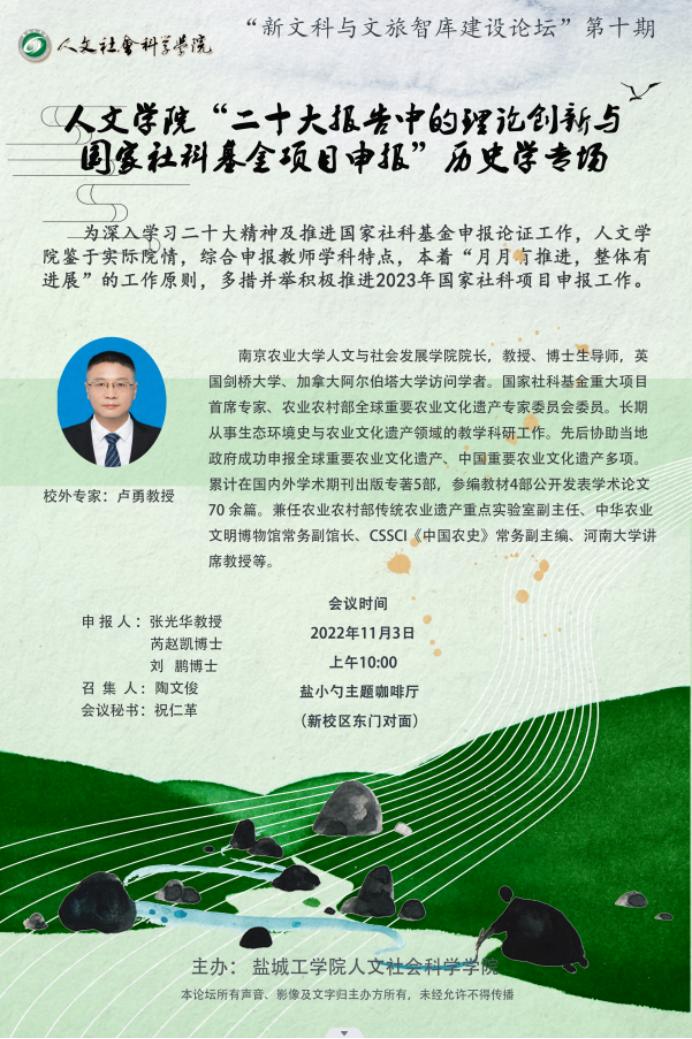 为深入学习二十大精神及推进国家社科基金申报论证工作,11月3日上午,人文学院举办“二十大报告中的理论创新与国家社科基金项目申报”历史学专场研讨活动。会议由陶文俊副院长主持,周晓燕院长、外国语学院副院长叶磊、社科处副处长焦微玲及社科处相关人员、人文学院部分教师参加了研讨。