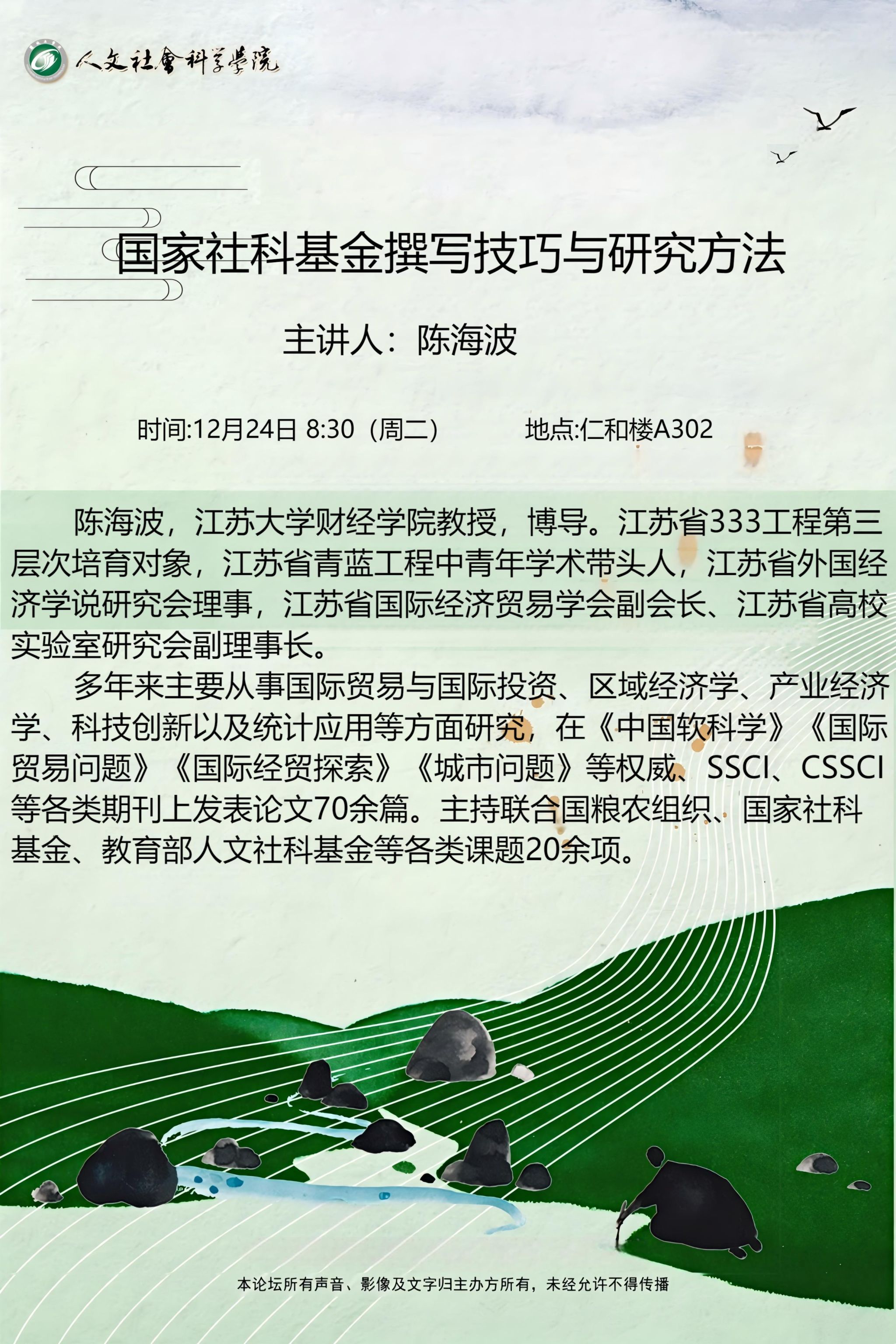 12月23日,人文学院在仁和楼A302教室成功举办了一场关于国家社科基金撰写技巧与研究方法的专题讲座。此次讲座特邀江苏大学财经学院教授陈海波主讲,人文学院院长周晓燕出席会议,副院长陶文俊主持会议。