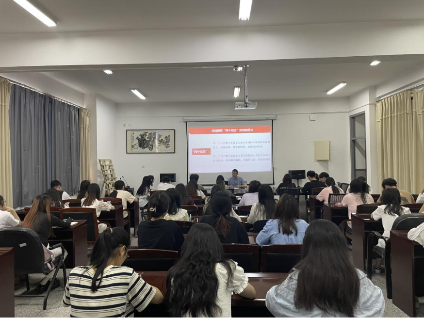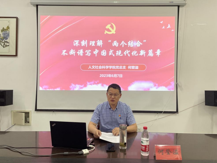 6月7日下午,人文学院在希望大道校区仁和楼A304会议室举办学习贯彻习近平新时代中国特色社会主义思想主题教育专题党课。学院党总支书记何登溢以“深刻理解‘两个结合’ 不断谱写中国式现代化新篇章”为题主讲,学院第22届团学干部、学生党员和入党积极分子代表参加。
