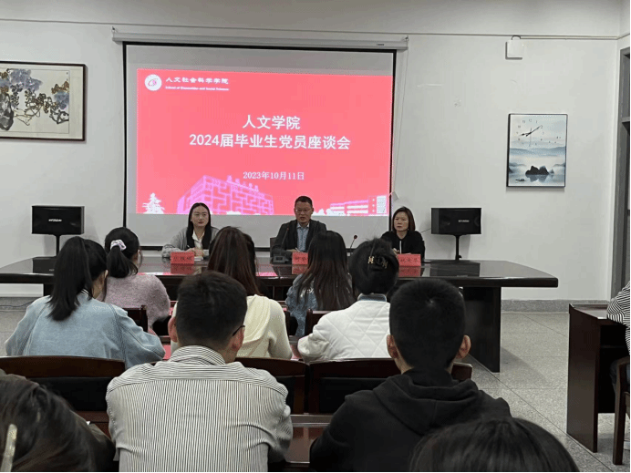 10月11日下午,人文学院在希望大道校区仁和楼A304召开2024届毕业生党员座谈会。人文学院党总支书记何登溢、党总支副书记姚爱华出席,全体毕业生党员参加,学生党支部书记乐珮珮主持会议。
