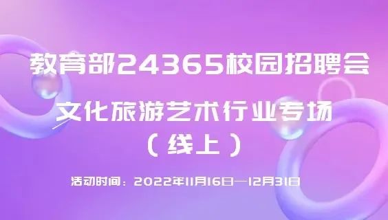 为深入贯彻党中央、国务院“稳就业”、“保就业”的决策部署和教育部对全国高校毕业生就业创业指导委员会工作要求,全力促进2023届文化旅游艺术专业高校毕业生更充分、更高质量就业,全国普通高校毕业生文旅艺术行业就业创业指导委员会(以下简称文旅艺就指委)联合全国相关高校于2022年11月16日至12月31日共同举办“教育部24365校园招聘会文化旅游艺术行业专场(线上)”。届时将有包括全国百余所高校文化旅游艺术专业毕业生参会应聘,我们诚挚地邀请并期待贵单位莅临参加。具体安排如下: