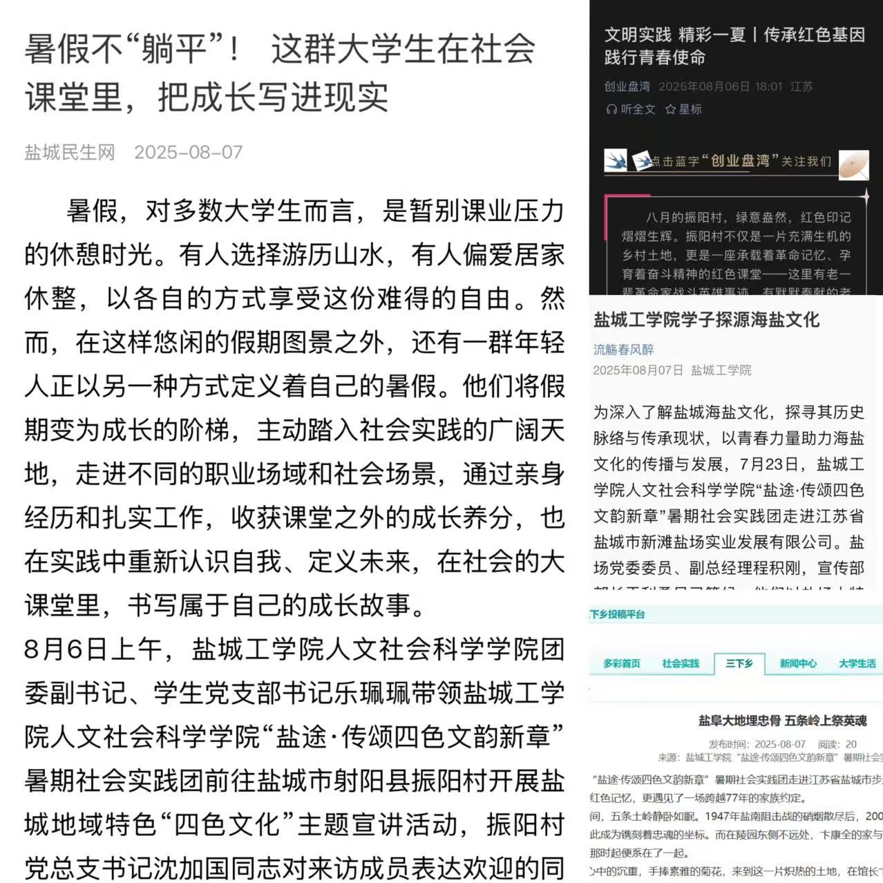 截至目前,团队实践成果已获中国青年网、盐城民生网、创业盘湾等多家媒体报道。展望未来,实践团将继续以“红色铁军精神”为魂,以“蓝色海洋文明”为帆,以“白色海盐文化”为脉,以“绿色生态底蕴”为韵,助力优秀地域文化在新时代绽放璀璨光芒,为打造青年参与文化传承的“盐城范式”注入澎湃青春动能。