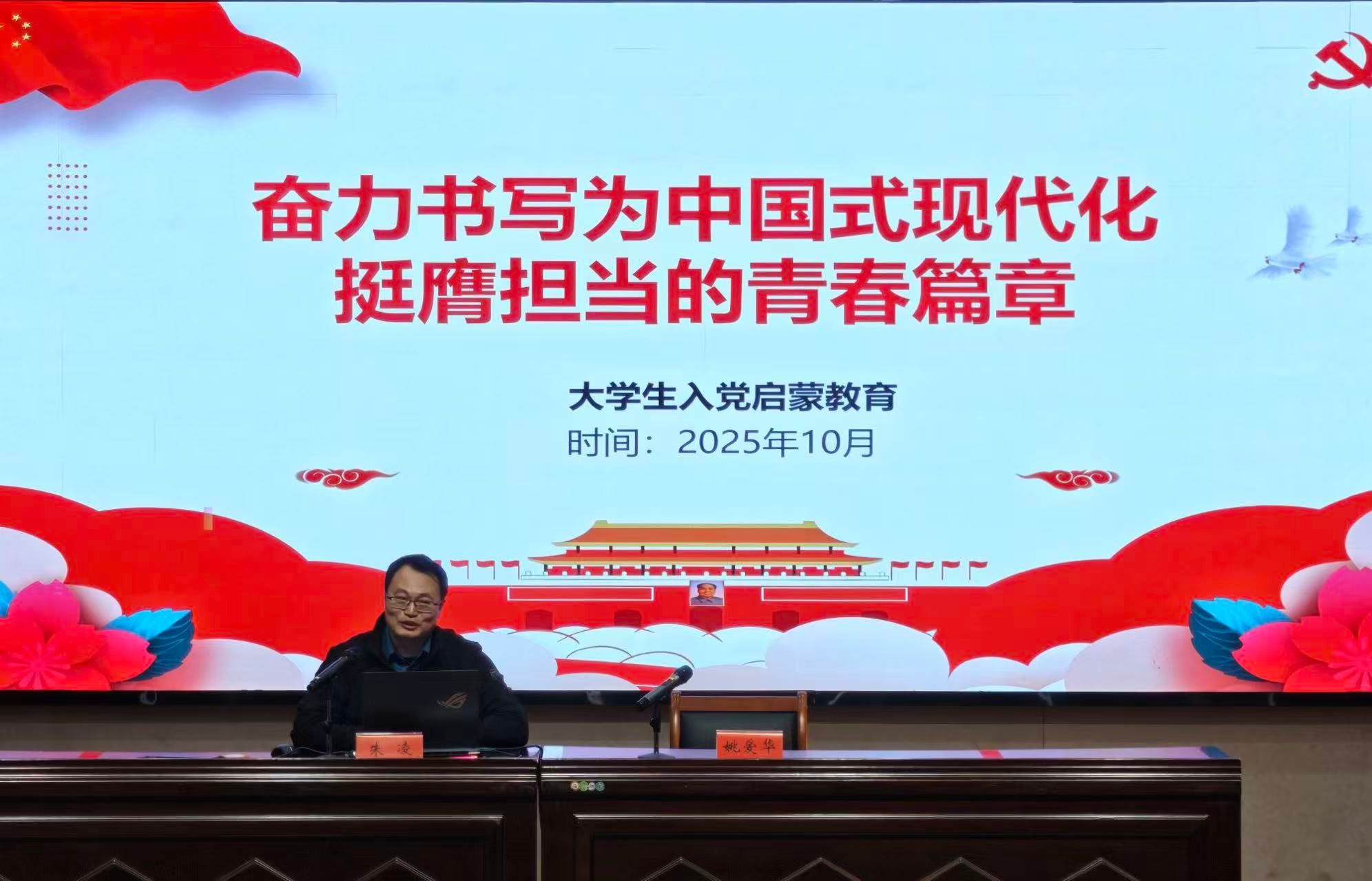 朱凌为全体新生作大学生入党启蒙教育专题辅导。他从追溯党的光辉起点出发,围绕入党申请与党员发展的规范流程展开系统讲解。他强调,每位入党申请人都应当准确把握党员发展的基本程序,明晰成为发展对象的具体条件,切实端正个人入党动机,并以高度负责的态度,规范履行各项入党手续。