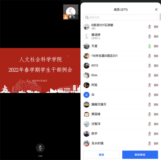 为了深入了解疫情期间学院学生各方面情况,优化学生干部服务职能,提高学生干部工作的计划性及组织性,4月30 日下午,人文学院运用腾讯会议召开线上学生干部例会。学院党总支副书记姚爱华、学工办副主任魏语婷、团委副书记邱天星、学团各部门副部长及以上干部和各班主要班委参加了本次会议,学生会主席张瑾主持会议。