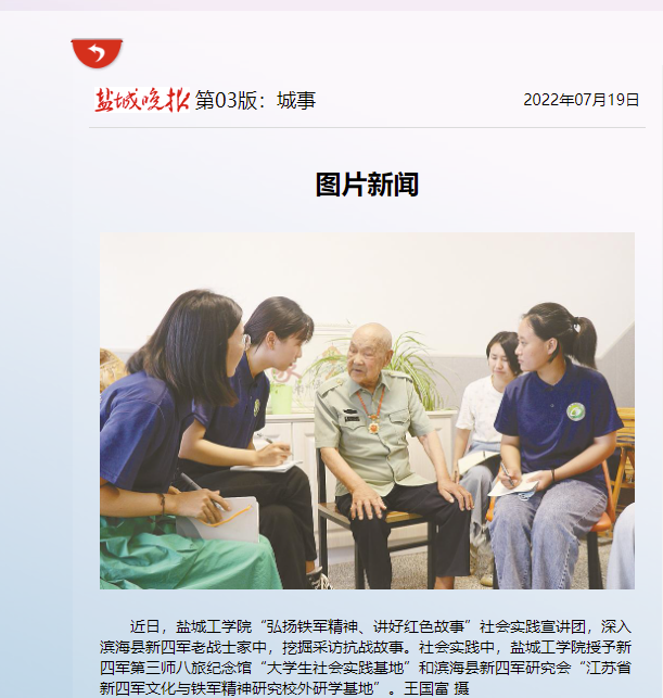 盐城晚报报道我院“弘扬铁军精神、讲好红色故事”社会实践宣讲团