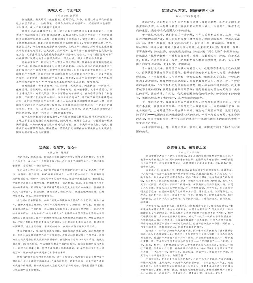 在“我的国,在笔下”主题征文活动中,人文学子充分发挥专业特长,以爱国主义为主题,引导学生立足自身,回顾历史,展望未来,用文字描述了新中国成立以来国家日新月异的变化,抒发了青年学生“生在国旗下,长在春风里,目光所至皆为华夏”的民族自豪感和爱国情怀,表达了青年学生“以吾辈之青春捍卫中华之盛世”的豪情壮志。