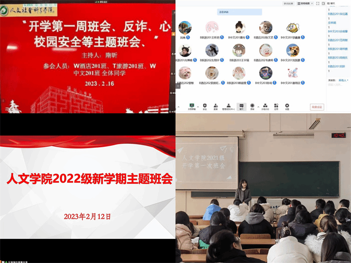 上好开学第一课,逐梦前行新学期。各班辅导员提前认真准备思想政治教育、安全维稳、疫情防控、健康管理、诚信考试、反诈骗等方面班会资料。从加强疫情防控、树立爱国意识、开展学风建设、防范电信网络诈骗、促进就业落实等方面,给同学们在新学期提供了明确的方向。