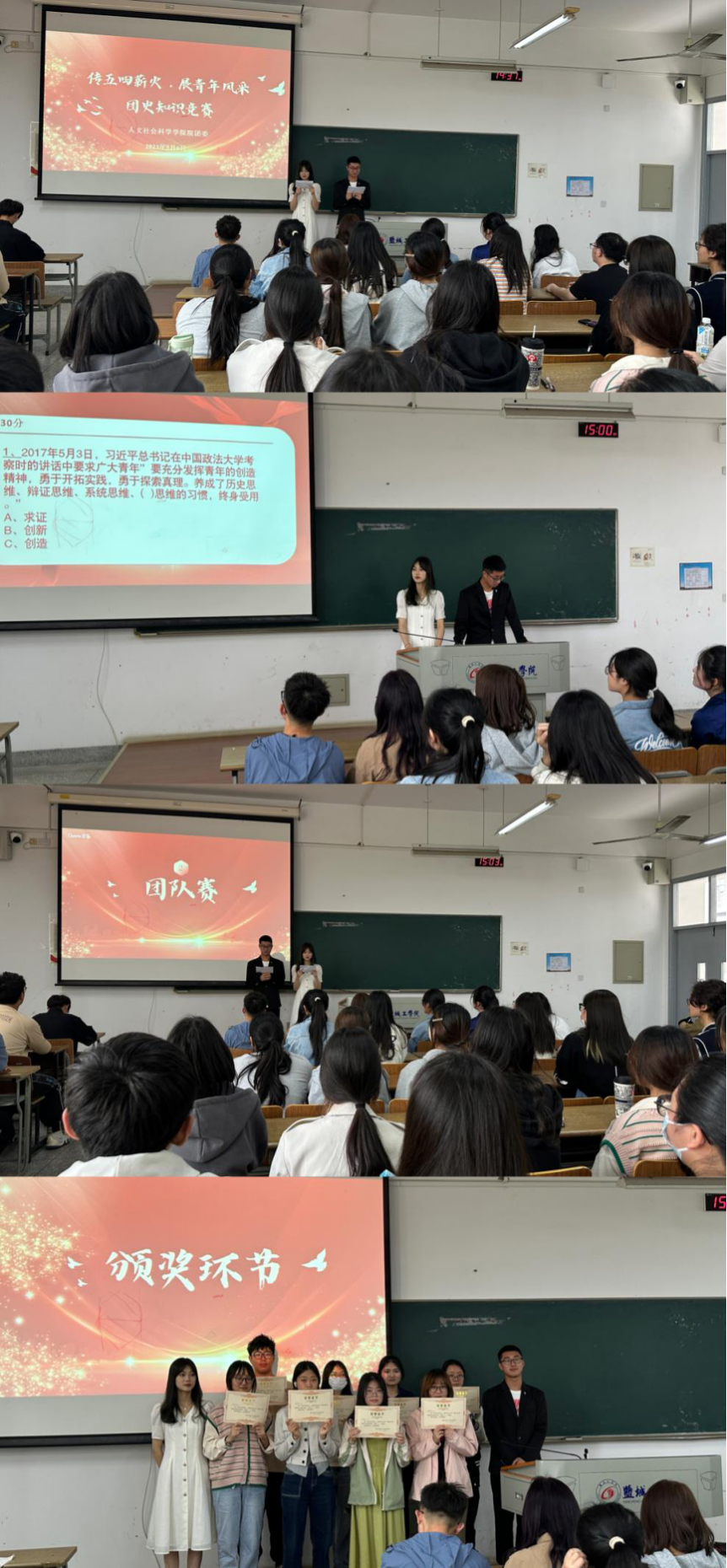 青春孕育无限希望,青年创造美好明天。为进一步加强团史学习教育,推动团史学习教育长效化、常态化发展,引导青年团员树立远大理想,肩负历史使命,勇担时代责任,5月6日至7日,人文学院在希望大道校区博学楼B303开展“传五四薪火,展青年风采”团史知识竞赛。