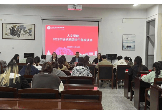 为进一步明确团学干部工作职责,促进学院团学工作高质量开展。10月11日下午,人文学院在希望大道校区仁和楼A304召开2023年秋学期团学干部座谈会。人文学院党总支书记何登溢、党总支副书记姚爱华出席会议,学院第22届学生会、团委主要学生干部参加。本次会议由学生党支部书记乐珮珮主持。