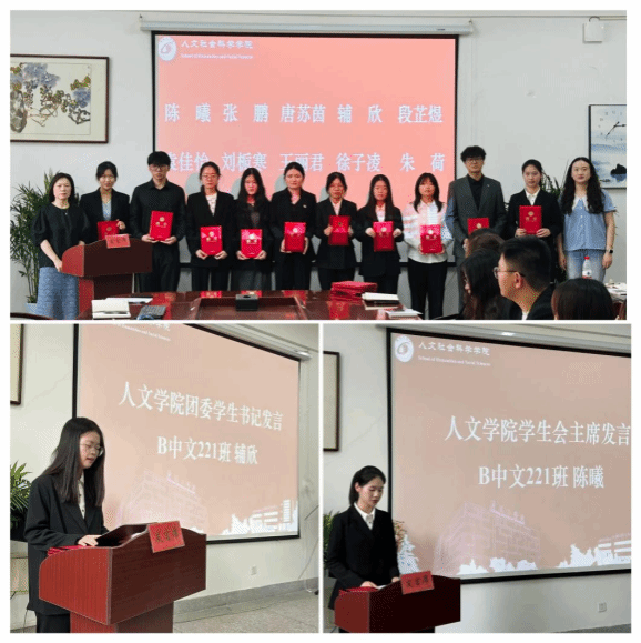 会上,姚爱华宣读了《人文学院第23届团学干部聘任名单》,与会领导、老师依次为新聘任的团学干部颁发聘书并表示祝贺。新任学生会主席陈曦、团委学生兼职副书记辅欣分别作表态发言。