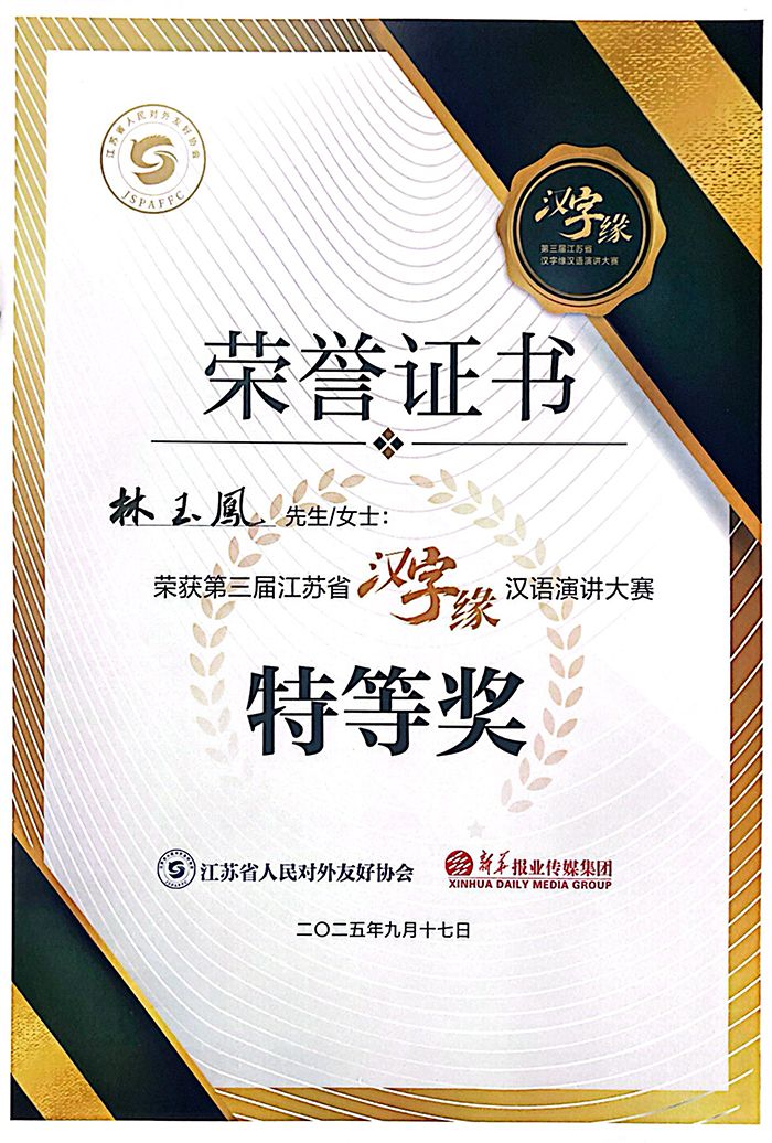 近日,第三届江苏省"汉字缘"汉语演讲大赛在南京落幕,我院B中文233班泰国留学生林玉凤以《超越山海的乡愁》主题的演讲摘得桂冠,成为全省13市选手中唯一特等奖获得者,即将代表江苏出征全国复赛。