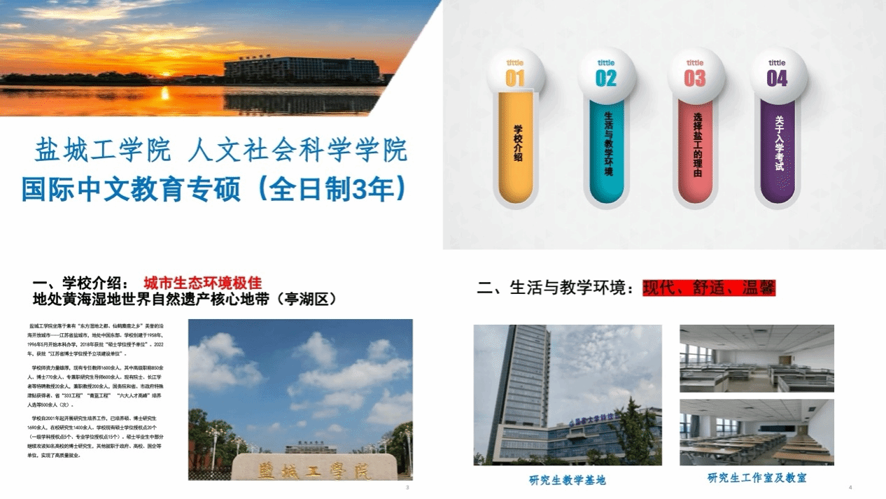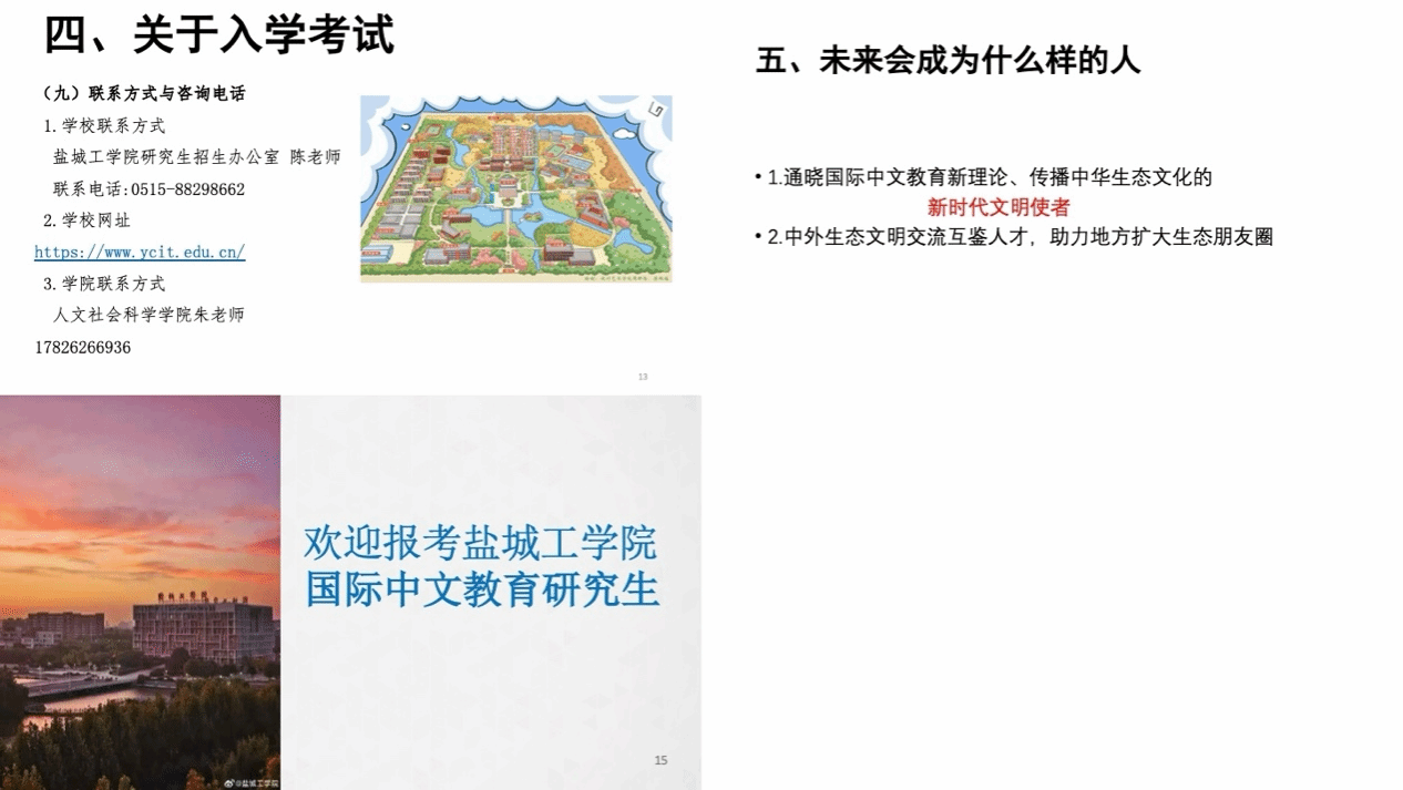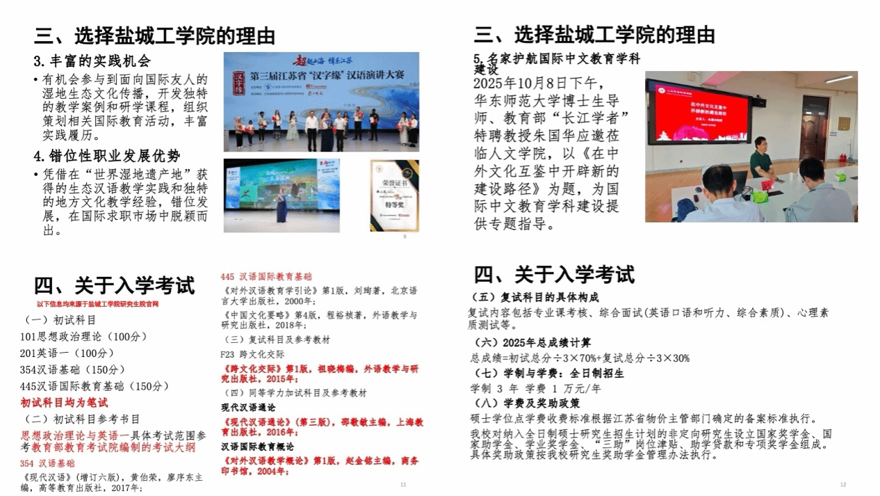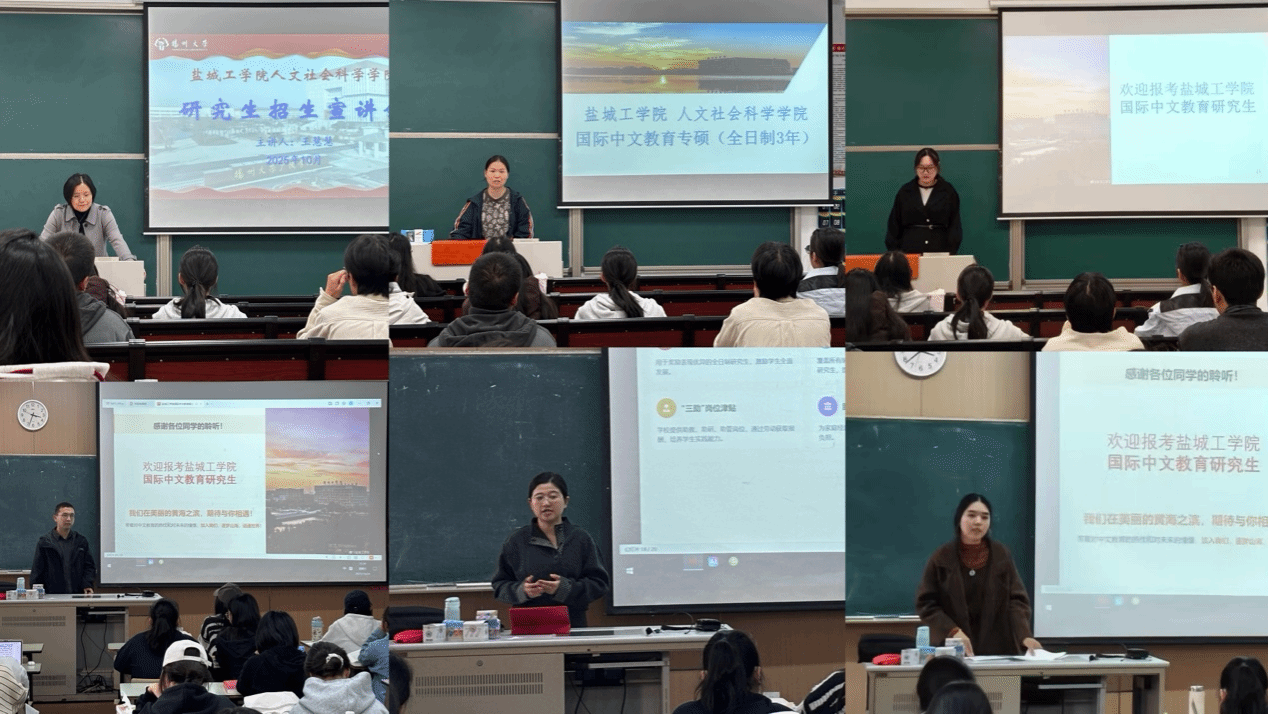 为提升学位点影响力,拓展优质生源渠道,10月中旬以来,学院组织由专业教师与在读研究生组成的宣传团队,先后前往扬州大学广陵学院、苏州科技大学天平等高校开展专场招生宣讲。团队精心准备宣讲材料,系统介绍学位点特色、培养模式、奖助政策与发展前景,并与考生现场交流互动,反响热烈。 此次宣讲有效增强了我院国际中文教育专业的认知度与吸引力。欢迎广大学子报考人文学院国际中文教育硕士研究生!感谢社会各界对我院学科建设工作的关注与支持!