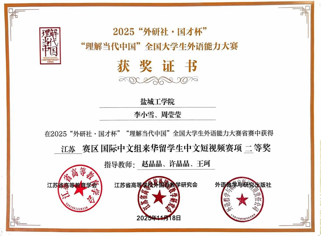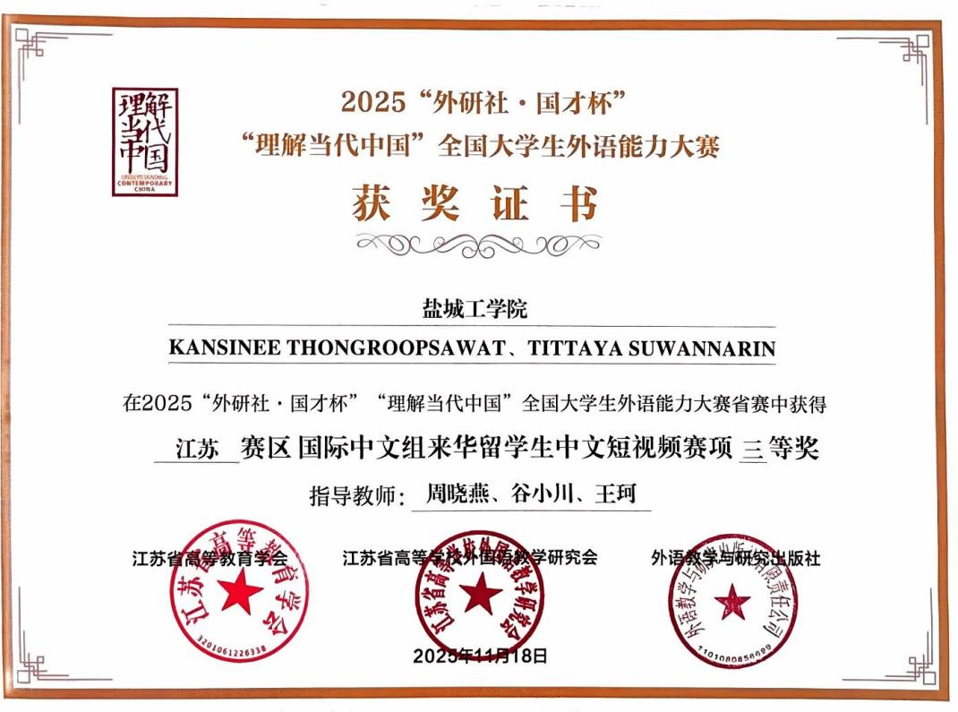 近日,2025“外研社·国才杯”“理解当代中国”全国大学生外语能力大赛江苏赛区国际中文组来华留学生中文短视频赛项评审结果正式揭晓。人文学院中文系李晓雪、周莹莹、林玉凤、李梦四位泰国留学生凭借扎实的中文功底、独特的创作视角与出色的跨文化表达能力荣获江苏赛区二等奖与三等奖,充分展现了我院留学生“理解中国、沟通世界”的青春风采。