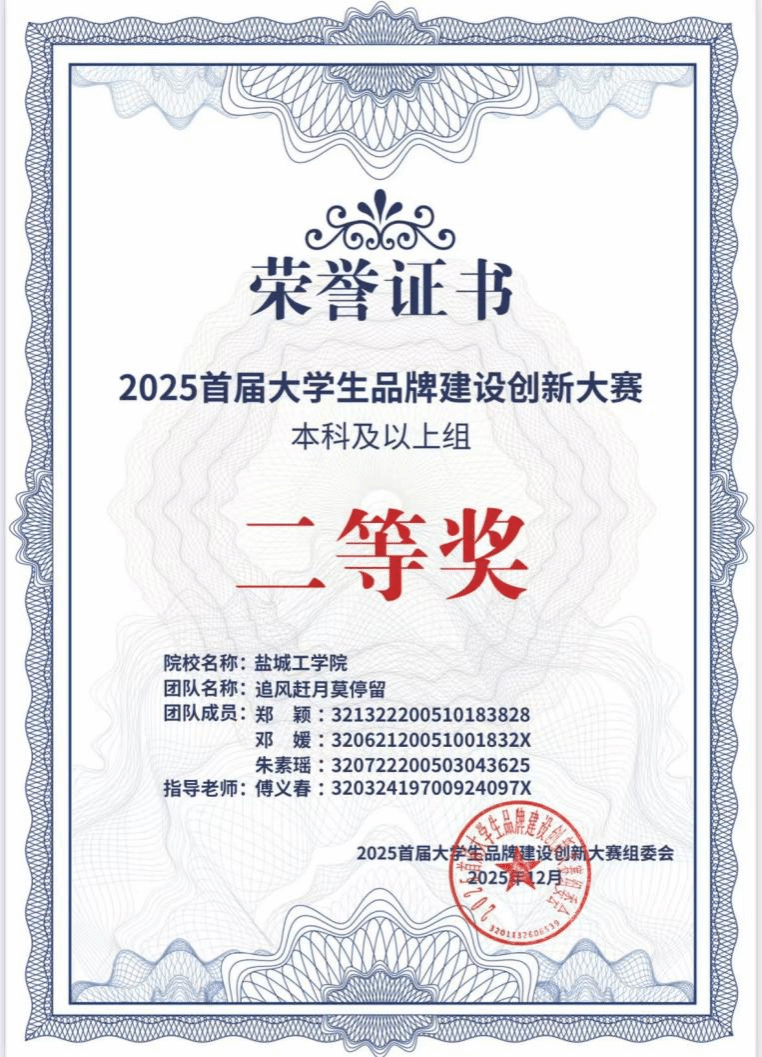 由我院傅义春老师指导,郑颖、邓媛、朱素瑶三名同学组建的“追风赶月莫停留队”精心准备、沉着应对、稳健发挥,经过线上初赛、现场决赛,凭借科学的品牌理念、新颖的创新思路和出色的现场展示,终获二等奖,展现了我院学子扎实的专业功底、敏锐的创新思维和良好的综合素养。