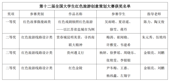 近日,第十二届全国大学生红色旅游创意策划大赛结果公布,喜讯传来。经过激烈角逐,我院4支团队突破重围,在华东赛区获奖。其中,一等奖1支队伍,二等奖3支队伍。