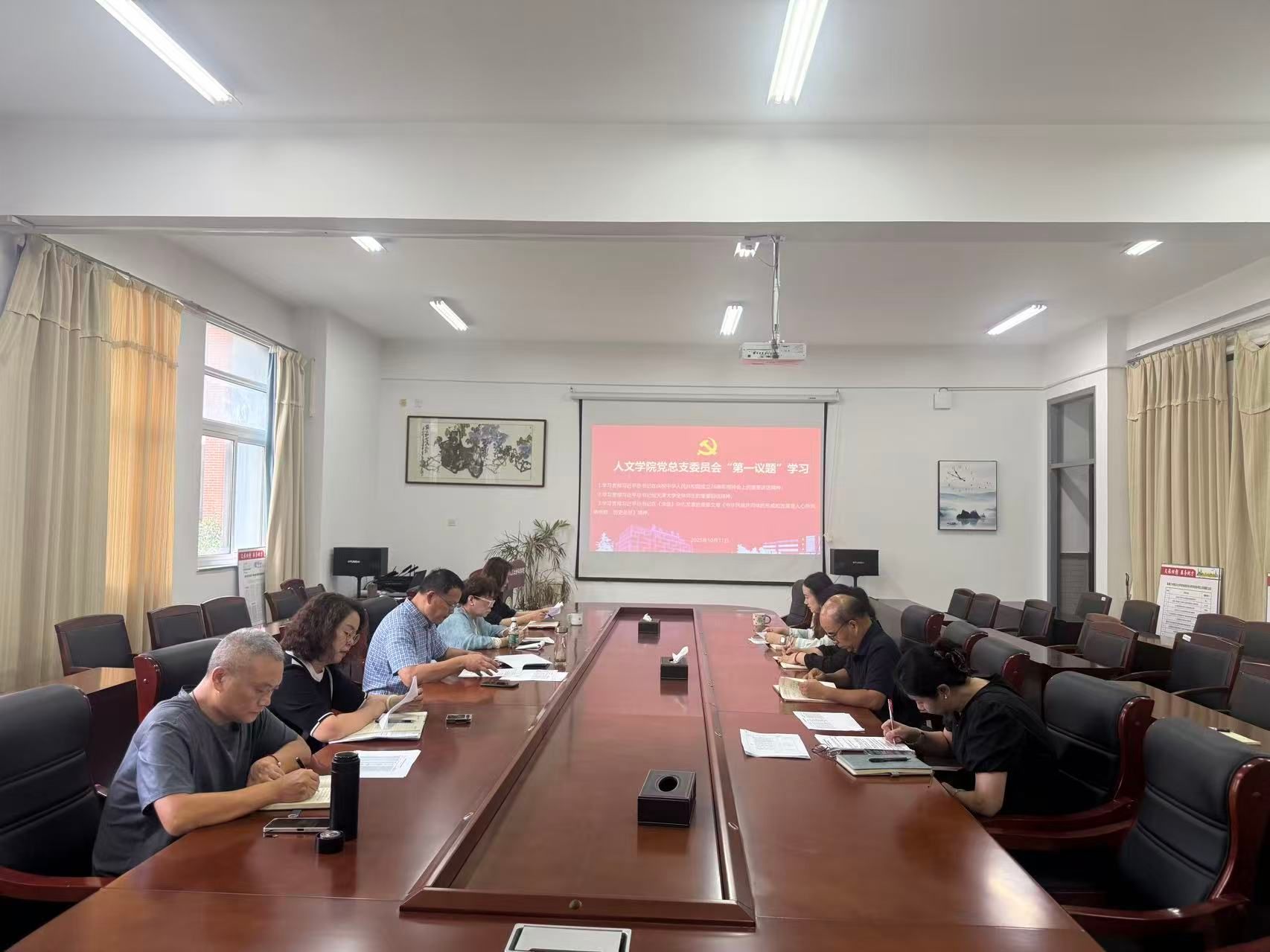 10月11日下午,在仁和楼A304会议室,人文学院党总支委员会以“第一议题”学习习近平总书记在庆祝中华人民共和国成立76周年招待会上的重要讲话精神、习近平总书记给天津大学全体师生的重要回信精神和习近平总书记在《求是》杂志发表的重要文章《中华民族共同体的形成和发展是人心所向、大势所趋、历史必然》精神。会议由学院党总支书记何登溢主持,党总支委员会委员及各支部书记参加。