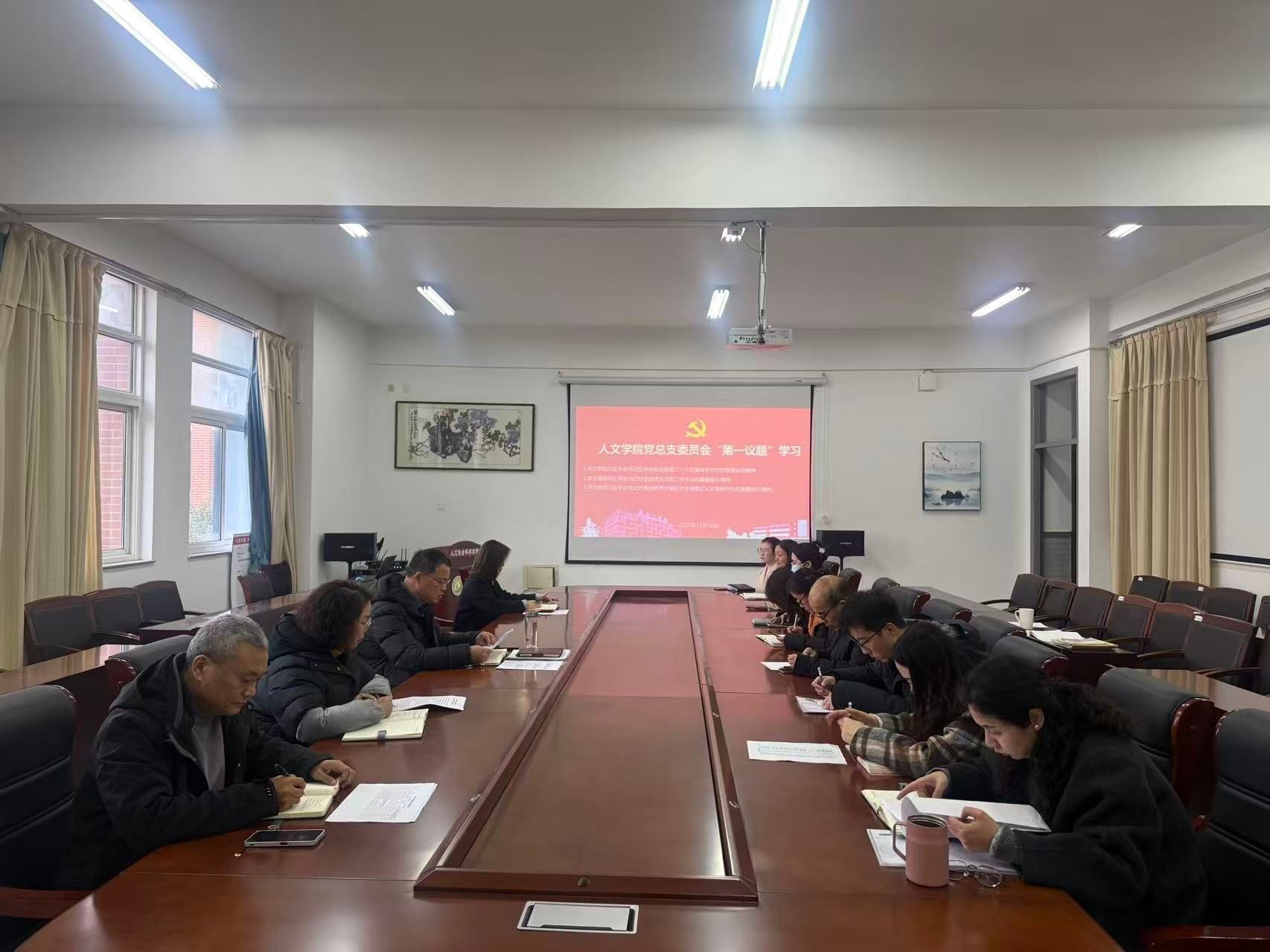 12月10日下午,在仁和楼A304会议室,人文学院党总支委员会以“第一议题”学习习近平总书记在中央政治局第二十三次集体学习时的重要讲话精神、习近平总书记对全面依法治国工作作出的重要指示精神和习近平总书记对香港新界大埔区住宅楼重大火灾事故作出的重要指示精神。会议由学院党总支书记何登溢主持,学院党总支理论学习中心组成员参加。