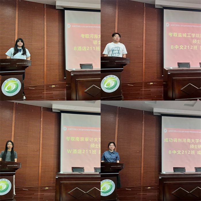会上,考取河海大学社会学专业硕士研究生、B酒店211班夏盈盈同学从择校、初试、复试这三个角度进行讲解,提醒同学们要脚踏实地,厚积薄发并祝愿2022级考研学子金榜题名,高分上岸。考取英国365集团国际中文教育专业硕士研究生、B中文212班吴康纯同学从个人情况及报考本校研究生优势两个方面展开讲述,他鼓励学弟学妹们“相信自己的实力,相信母校的培养——选择本校,就是选择高效成功!”。考取南京审计大学公共管理专业硕士研究生、W酒店211班郑项悦同学结合自身从专科到本科,再从本科到研究生的经历,她鼓励学弟、学妹们“把书背烂,把题刷烂,克服苦难,一定上岸!”。成功调剂并考取河南大学中国语言文学专业硕士研究生、B中文212班成宜吉同学从调剂原因、调剂择校、调剂复试三个方面向大家进行考研调剂的讲解,并鼓励大家不要轻言放弃,坚持就是胜利!